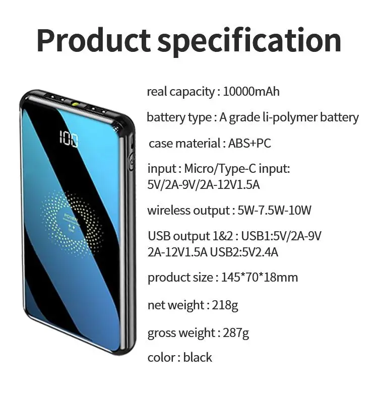 Product Name | Mirror Design Slim 10000mah PD Fast Charge Wireless Power Bank with Digital Display |