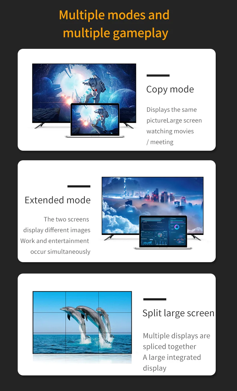 5. Support multiple modes, copy mode: display the same screen, watch a movie/conference on a big screen; expand mode: display different screens on two screens, work and entertain at the same time; spliced large screen: multiple displays are spliced into a large integrated display