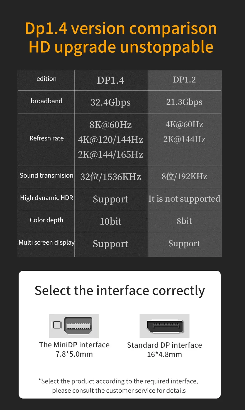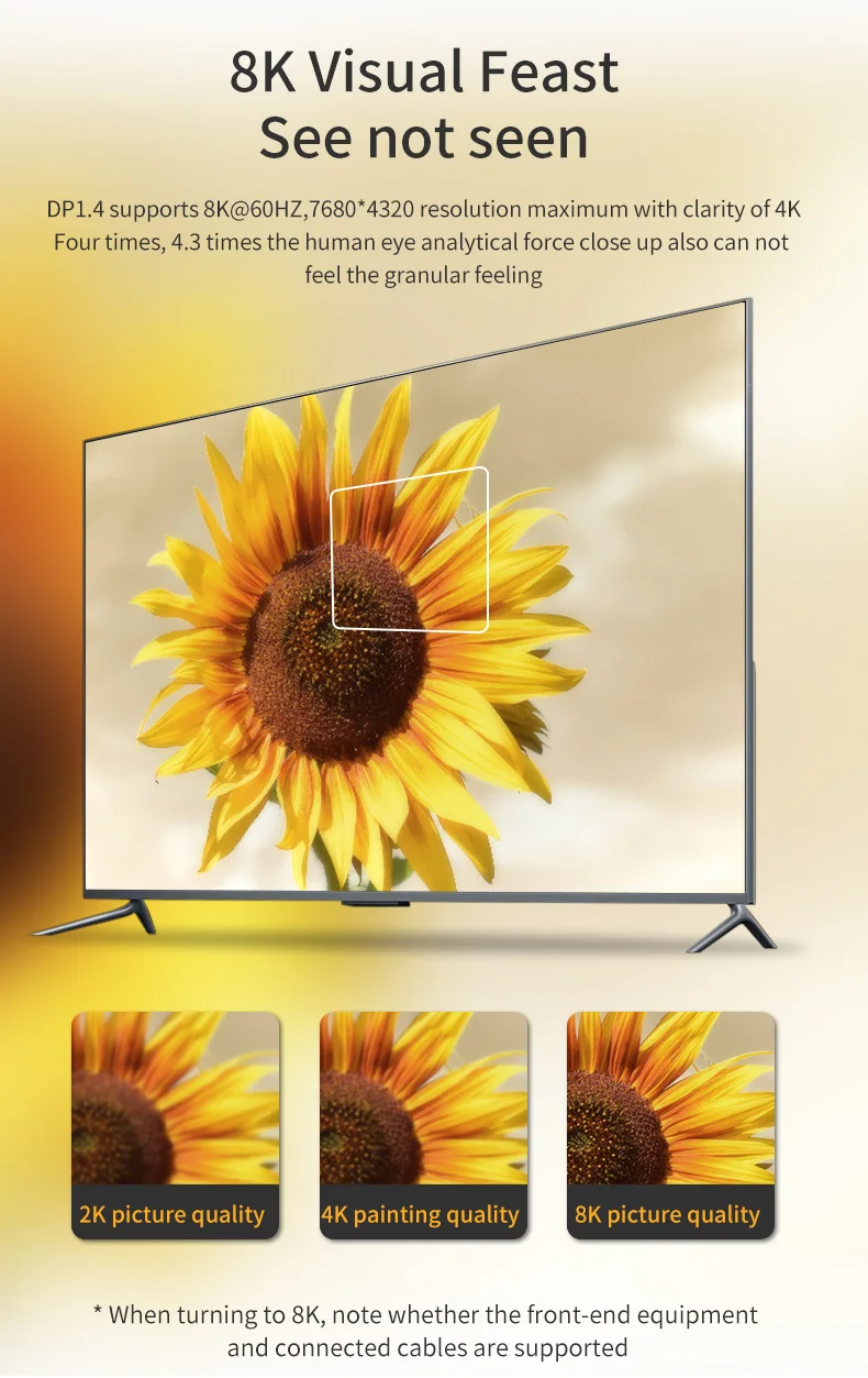 3.DP1.4 supports up to 8K@60HZ, 7680*4320 resolution, the resolution is four times that of 4K, and the resolution of human eyes is 4.3 times that of the human eye without feeling grainy at close range.