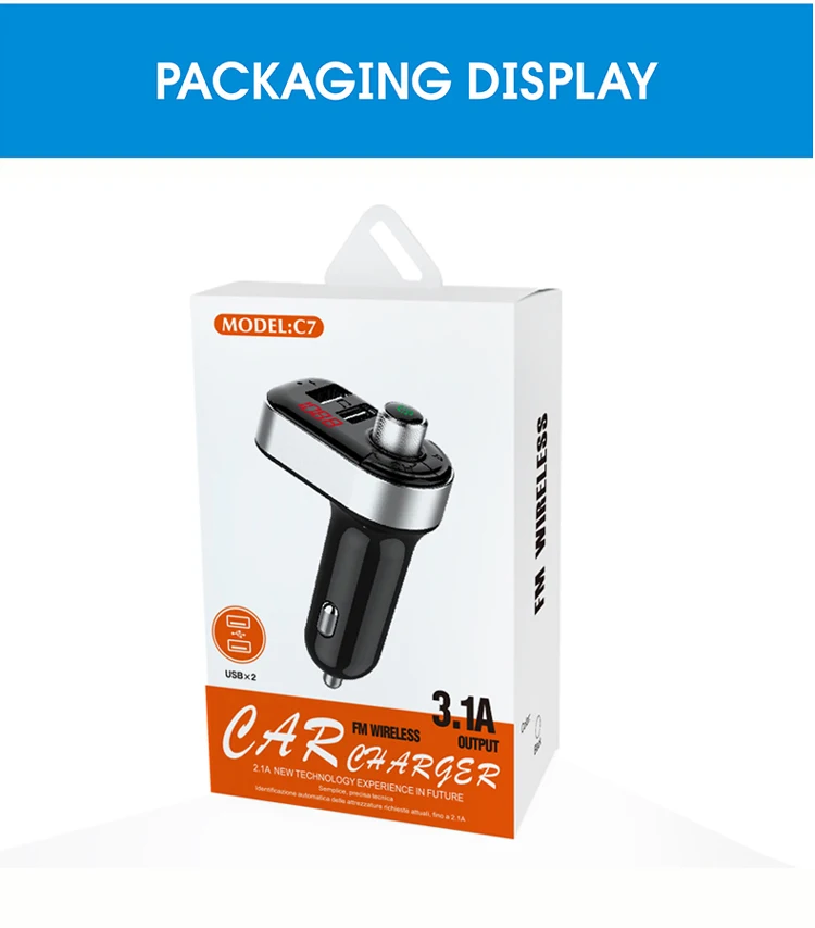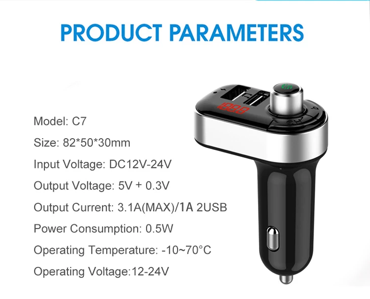 CAR CHARGER, Playback, FM Transmitter, Hands-free, Fast Charging, screen display, Power Off Memory, Hi-Res Sound, Hands-free Calls