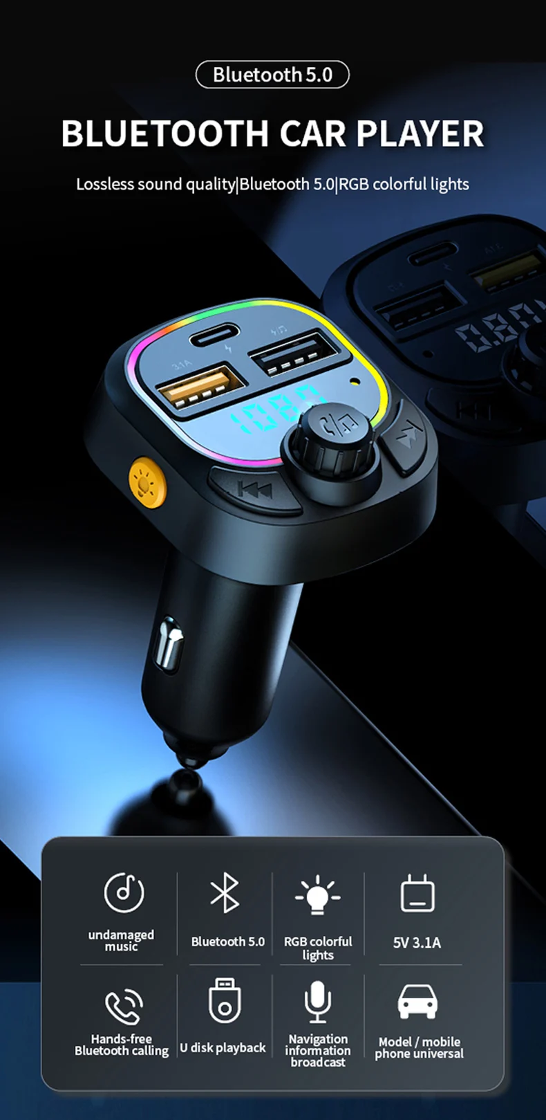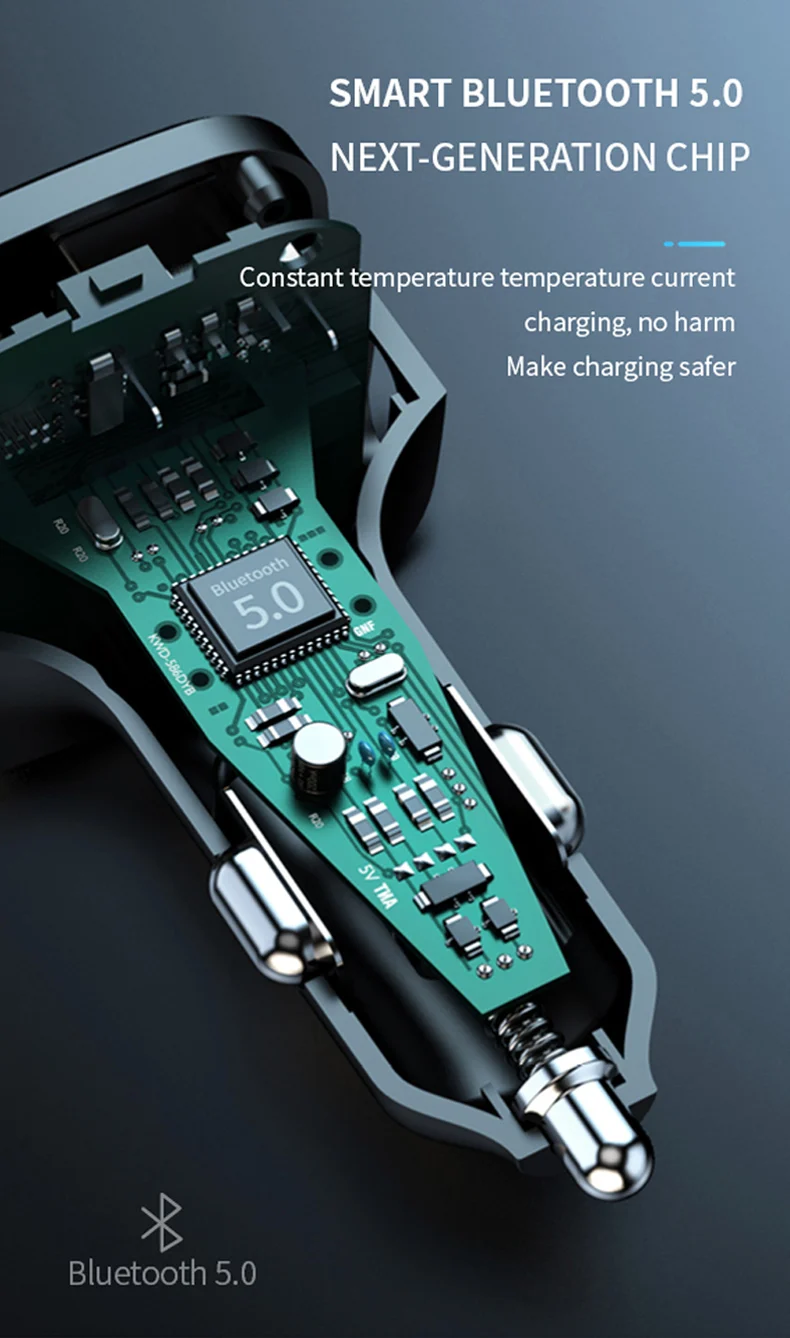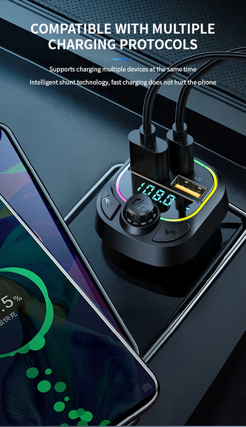 CAR CHARGER, Playback, FM Transmitter, Hands-free, Fast Charging, screen display, Power Off Memory, Hi-Res Sound, BluetoothHandsfree Calls