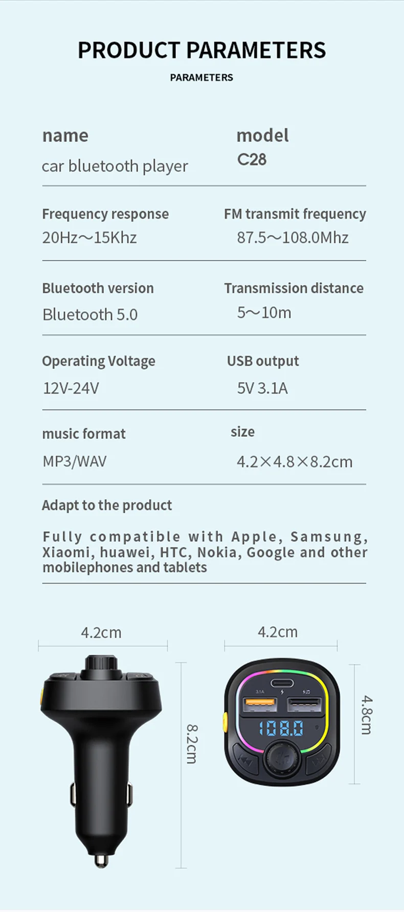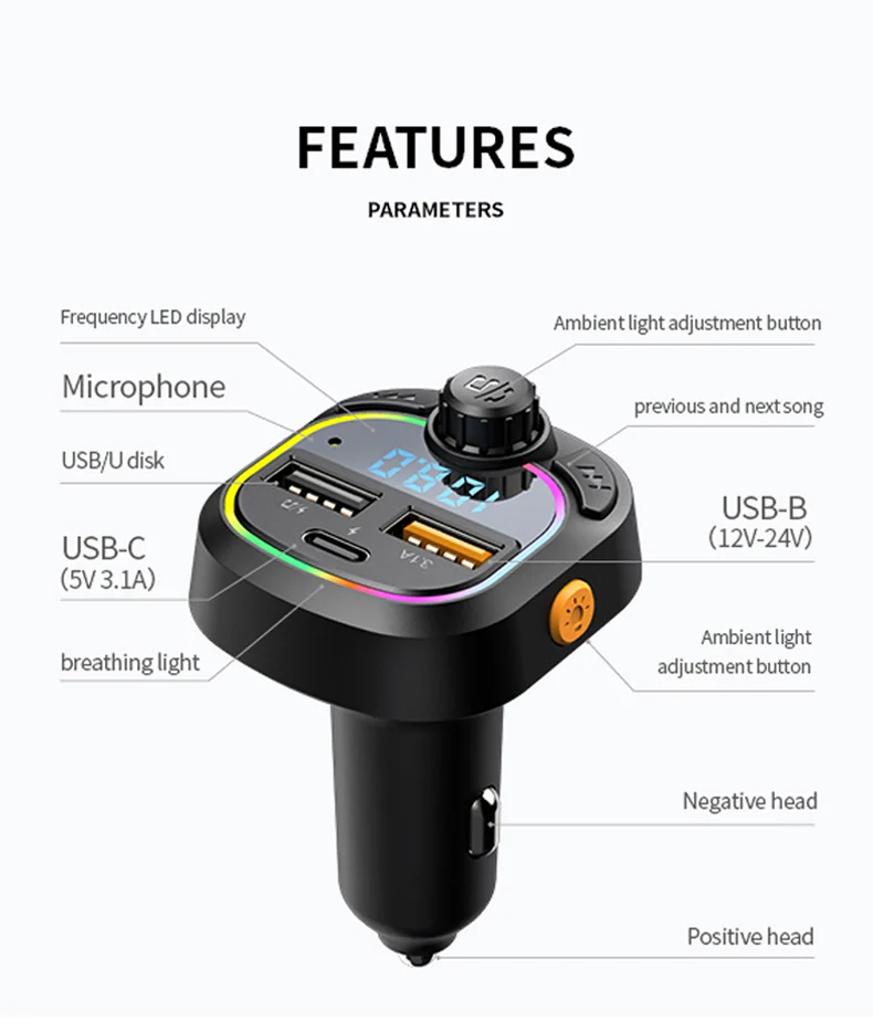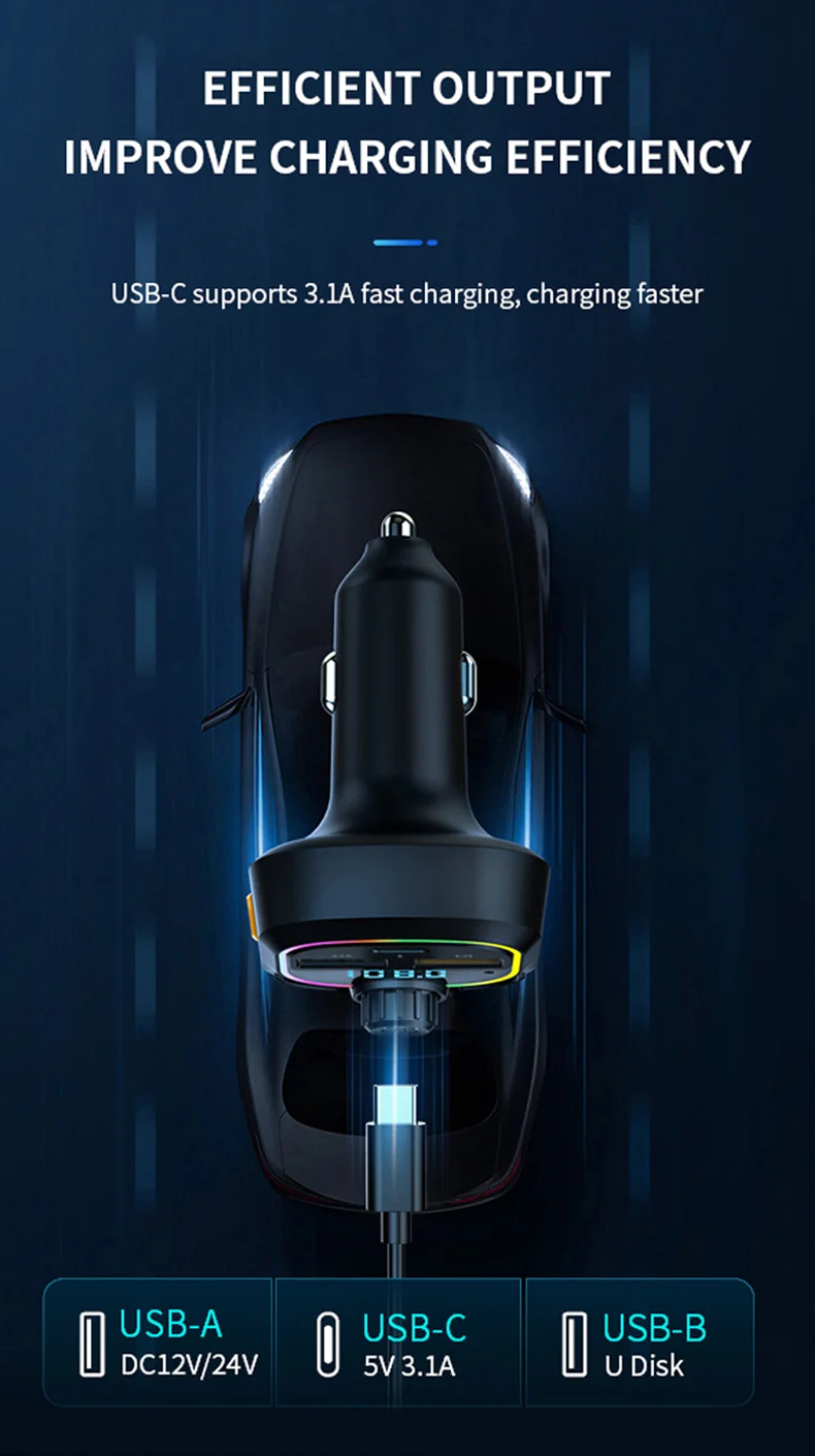 CAR CHARGER, Playback, FM Transmitter, Hands-free, Fast Charging, screen display, Power Off Memory, Hi-Res Sound, BluetoothHandsfree Calls