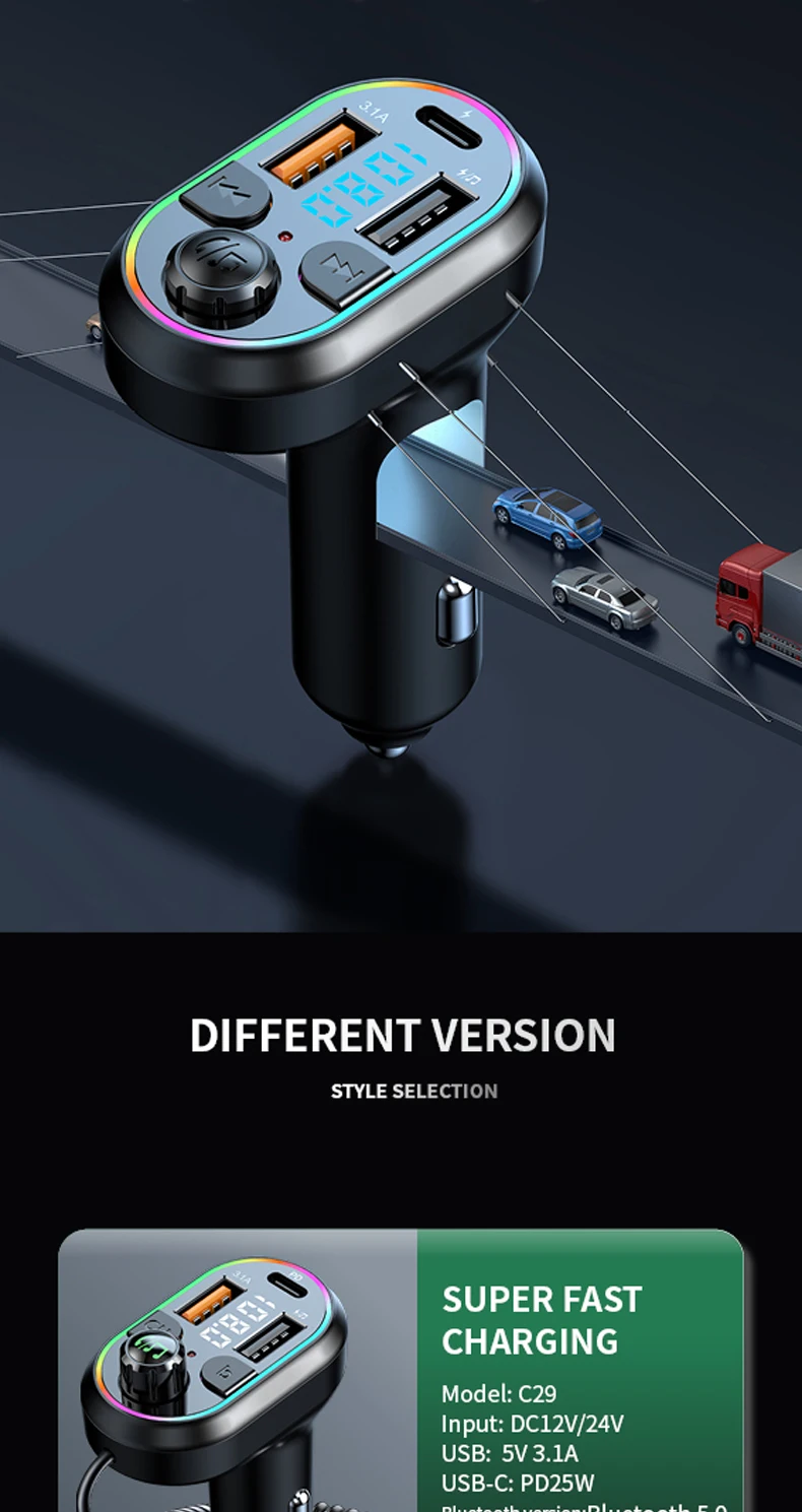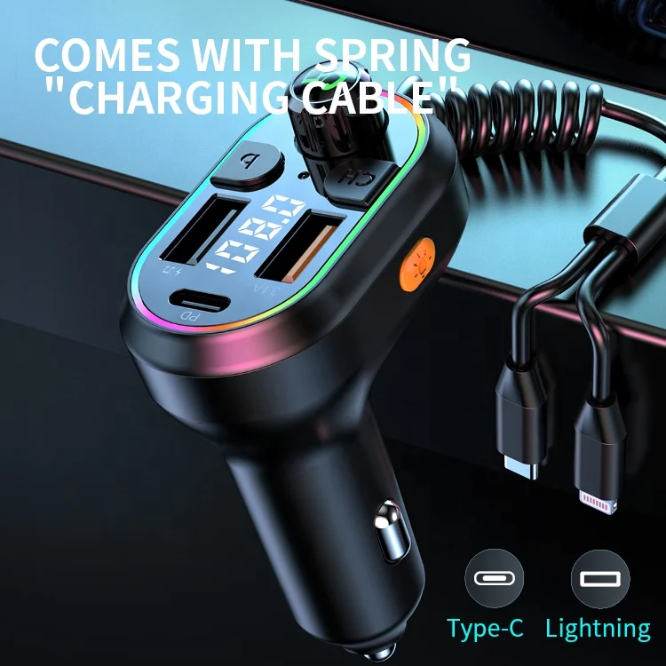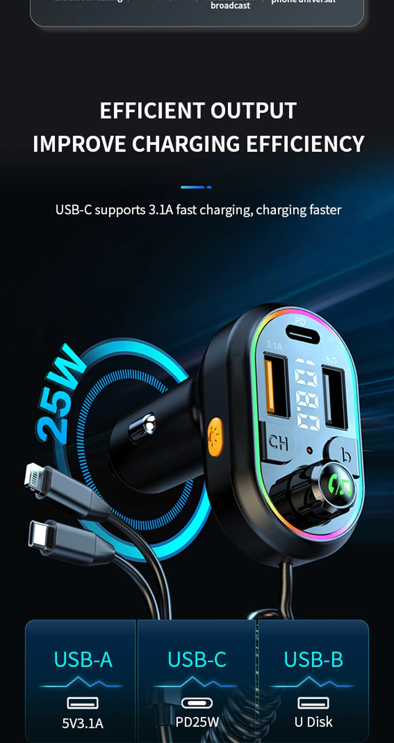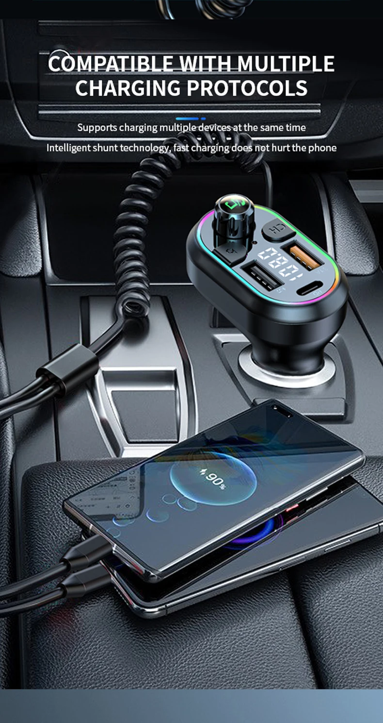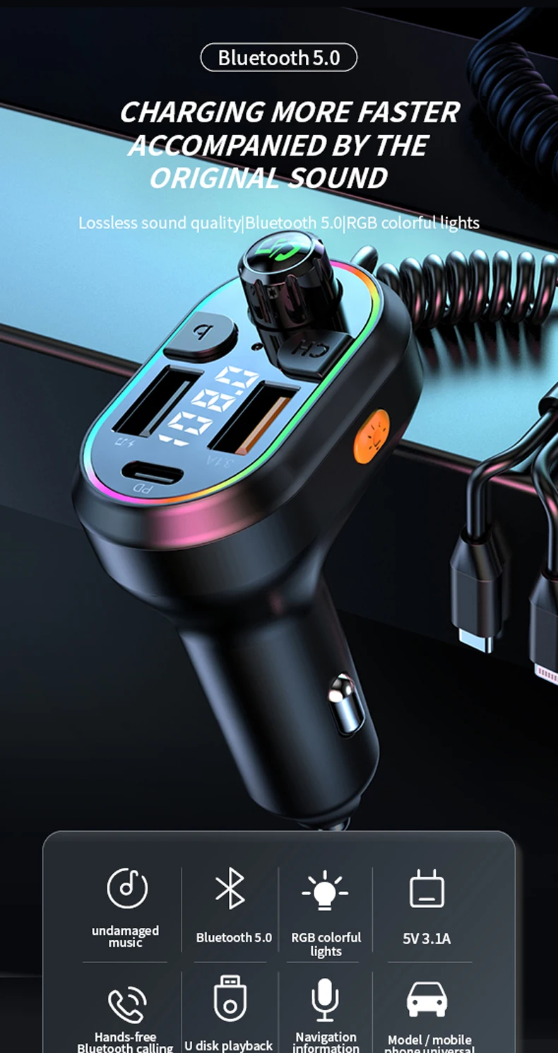 CAR CHARGER, Playback, FM Transmitter, Hands-free, Fast Charging, Colorful lights, Power Off Memory, Hi-Res Sound