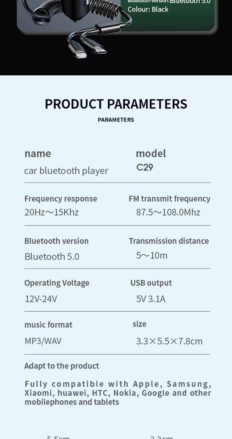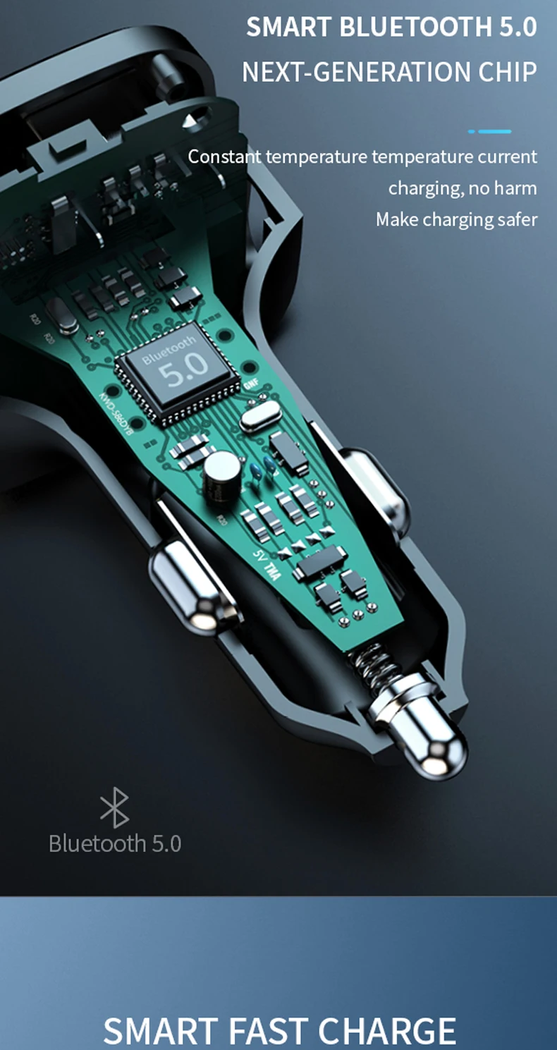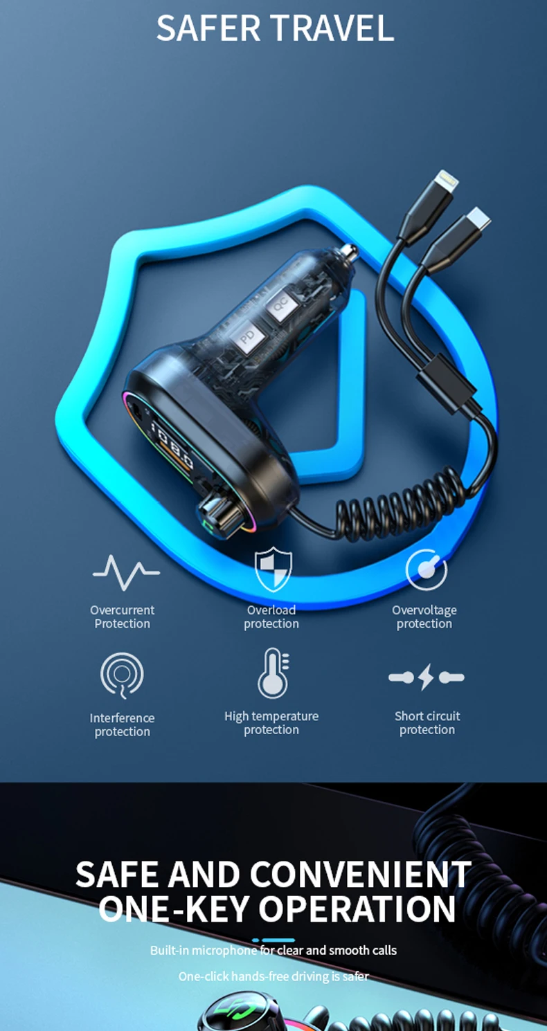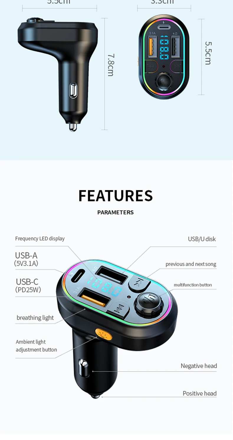 CAR CHARGER, Playback, FM Transmitter, Hands-free, Fast Charging, Colorful lights, Power Off Memory, Hi-Res Sound