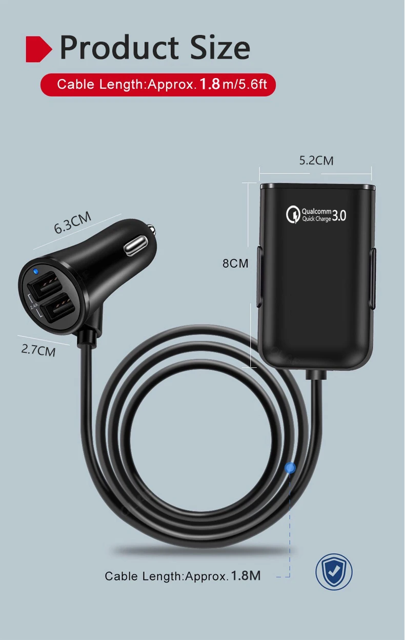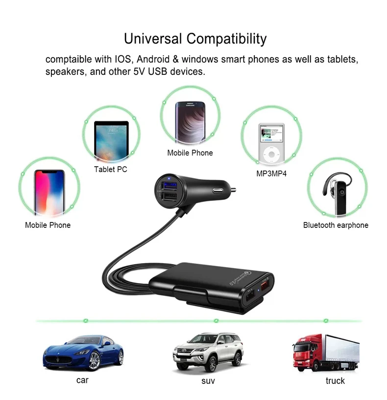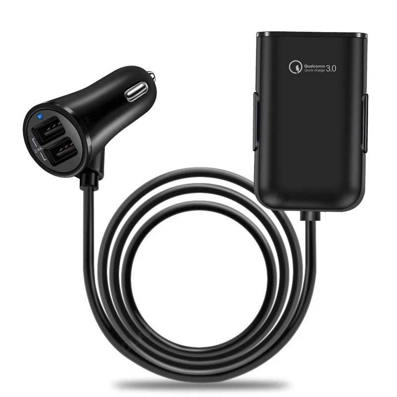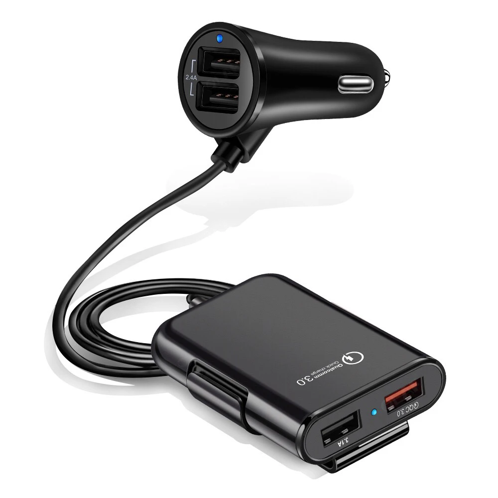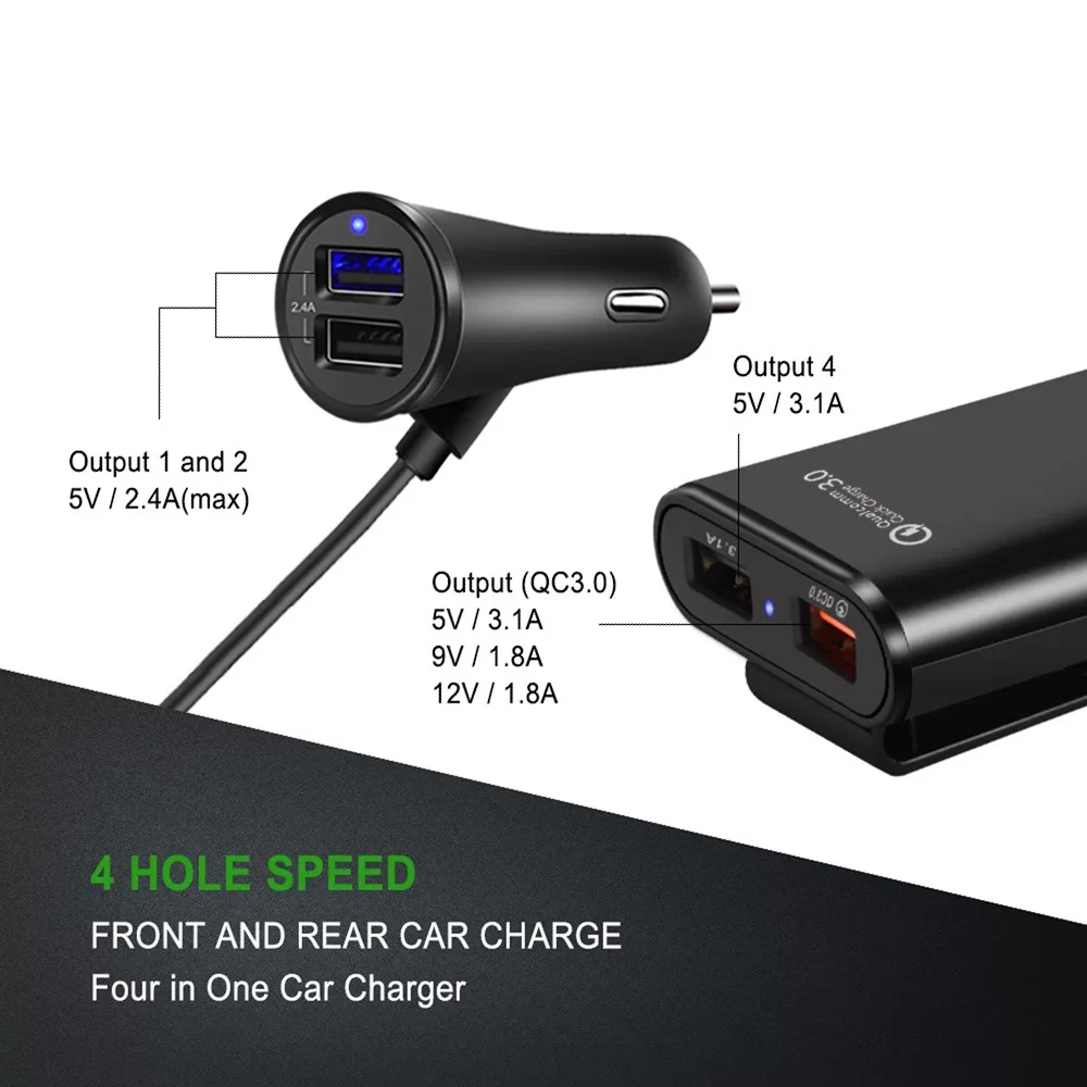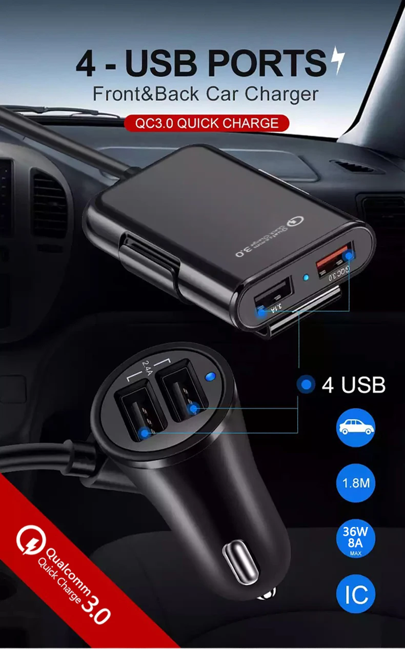 QC3.0 Fast Charger 8A 4 Ports USB mobile phone Car Charger with Extending USB HUB for Front Back Seat Charging at the same time