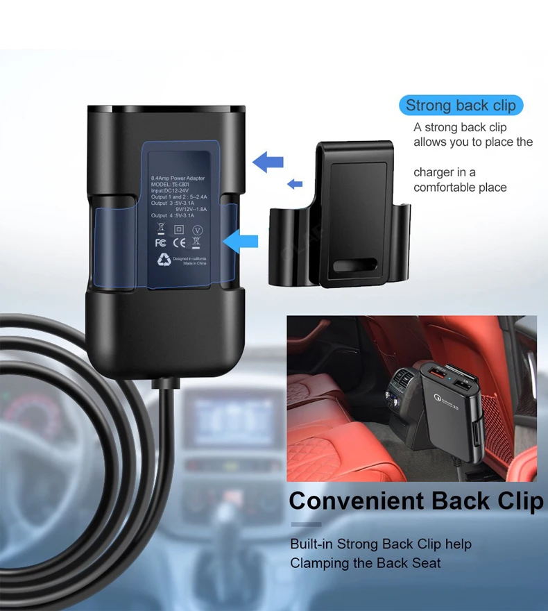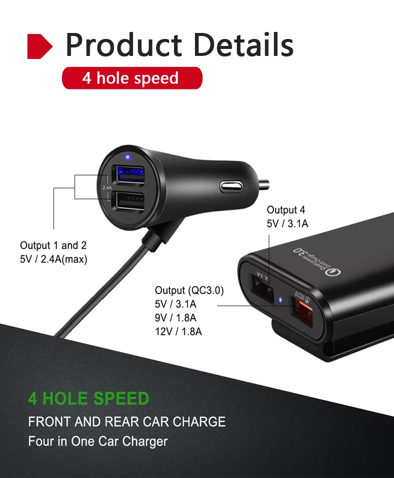 Rear seat: QC: 5V/3A 9V/2A 12V/1.5A USB : 5V/3.1A