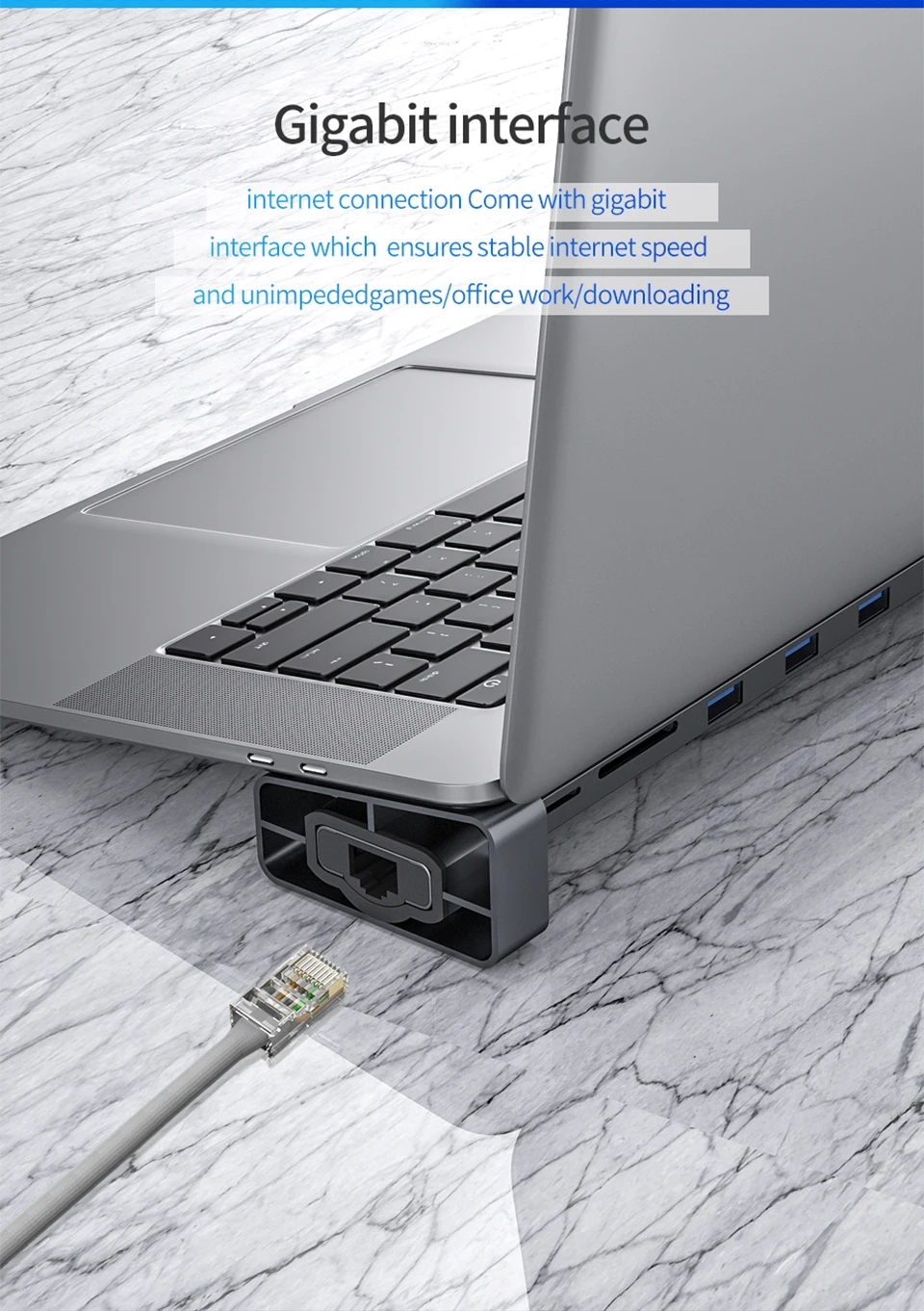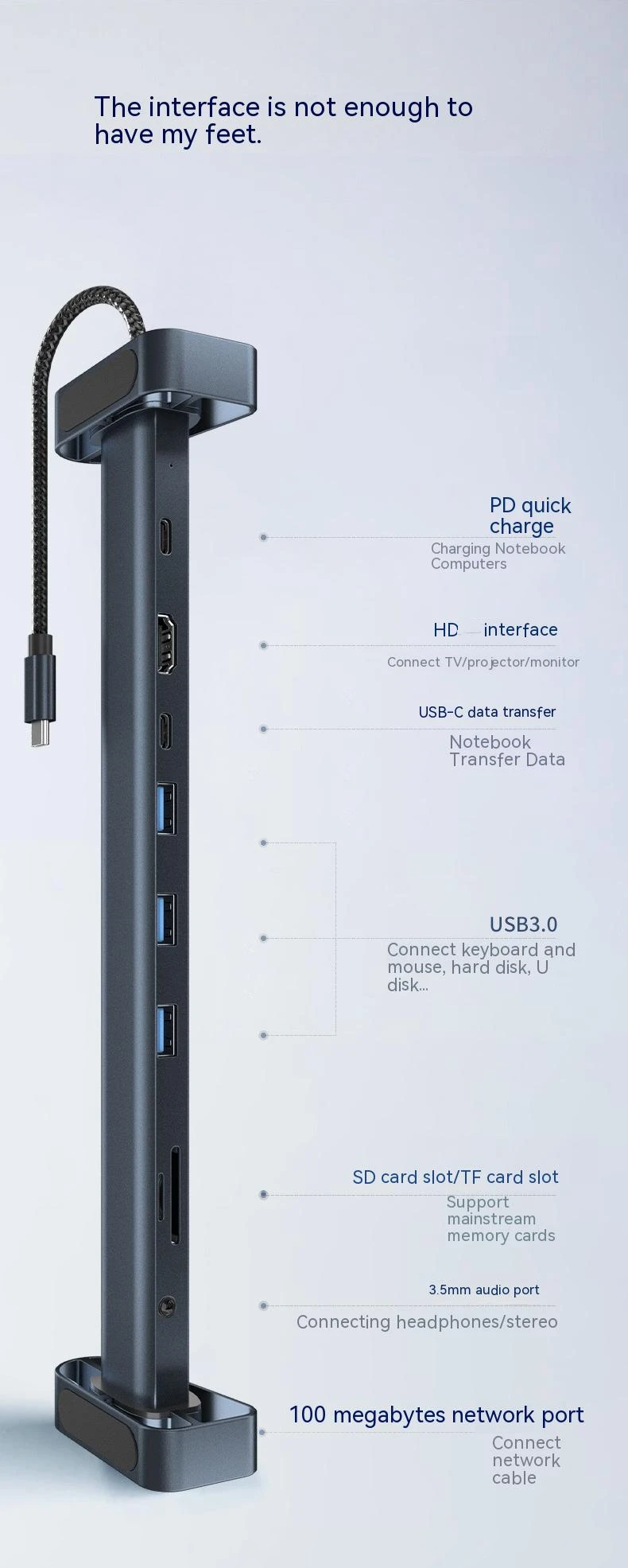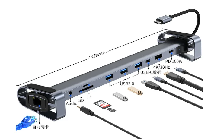 type C to USB3.0*3+PD100W*1+USB-C data transfer*1++HDTV 4K 30HZ * 1+TF *1+SD *1+3.5mm Audio*1+RJ45 100Mbps*1