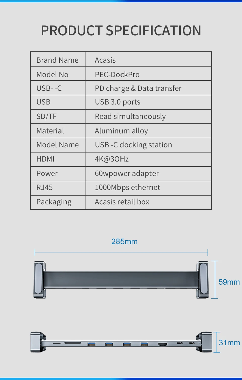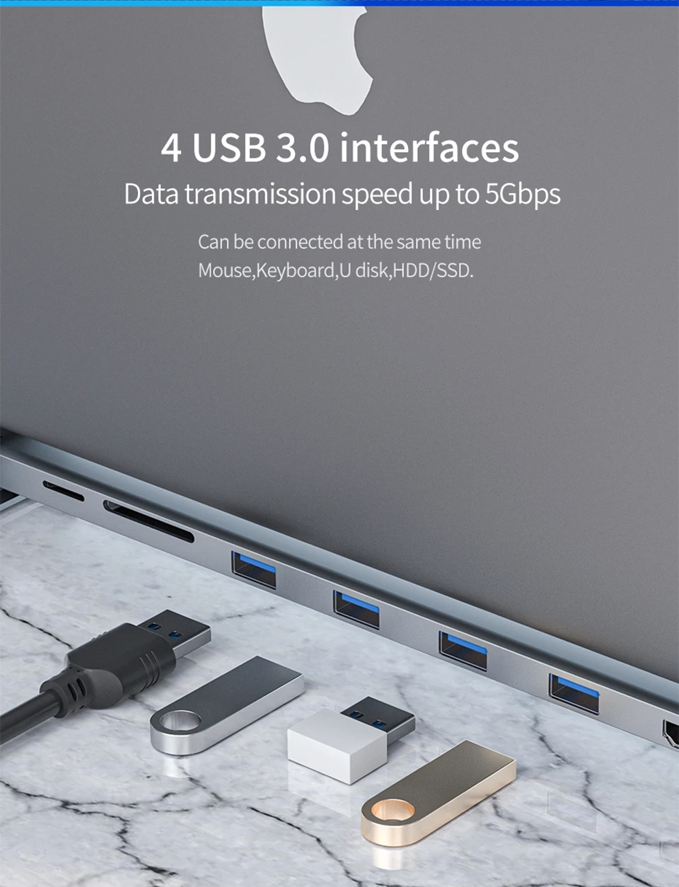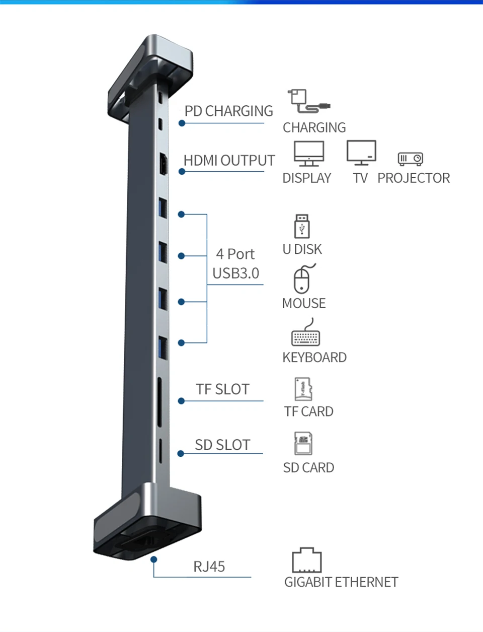 type C to USB3.0*3+PD100W*1+USB-C data transfer*1++HDTV 4K 30HZ * 1+TF *1+SD *1+3.5mm Audio*1+RJ45 100Mbps*1
